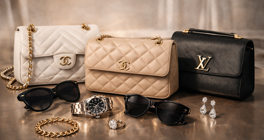 Designer handbags, luxury watches, statement sunglasses, and fine jewelry.